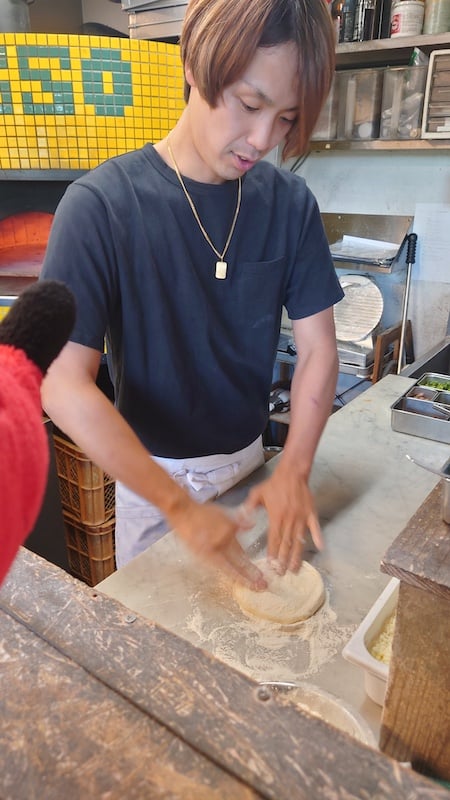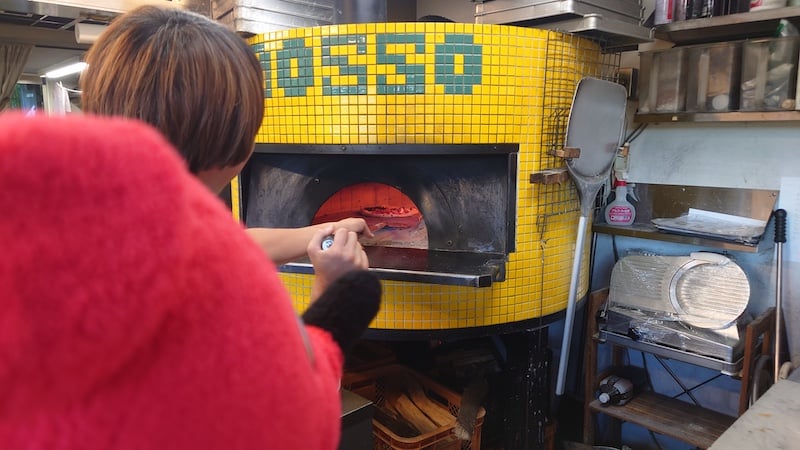 中村店長:ピッツァボッソっていうピザが 1枚で四季を堪能してもらえるピザでして、春が南房総産の菜の花と銚子のイワシを使ったピザで、夏が大多喜産バジルのジェノベーゼとトマトを添えたピザでして、秋が佐倉きのこ園のしいたけとスペイン産の生ハムで、冬が八街産のゆで落花生とベーコンになりますね。今の具材が全部 1枚で乗っかってます。そうですね、千葉県 1周楽しめるピザだと思いますので、具材をですね。ふふふ。トマトソースはですね。マルゲリータのピザでしたら、千葉県産のトマトを使ってお店で仕込んでます。ちょっと完熟が甘かったりしたら、お店で完熟するまで寝かせて、それを火にかけて煮込むんですけど、4、5時間かけて煮込んでマルゲリータのソースを作ってますね。煮込みっぱなしというか、かき混ぜながら。