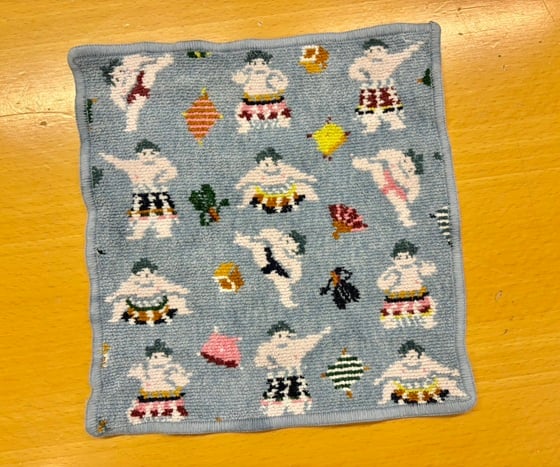 - 母からもらった、お相撲さんのハンカチ。ここ一番、四股を踏んで頑張りたい時にお守りのように持っていきます。