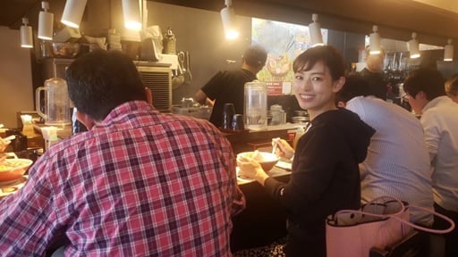 - ラーメンってカウンターでさくっと食べることが多いから、あまり食べてるところって写真に残ってないですよね。そんな中、奇跡的に1枚スマホの中から見つかりました。食べる直前、幸せの絶頂です。