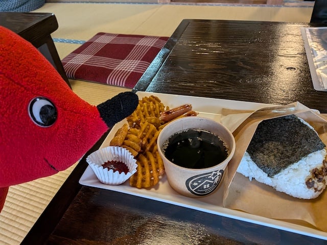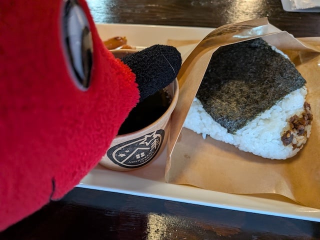 一人では難しいけど、写真撮りたい、という方が結構いらっしゃるそうで。お顔の小さい方ぐらいの大きさのおにぎりですからインパクトはありますね。家族やグループで申し込まれるケースが多いようですが、中には完食した猛者もいるようです。