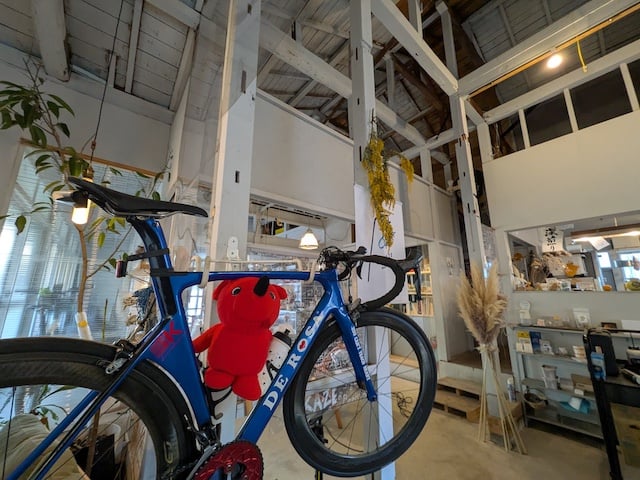 白石さん:僕の中でオモロイと思ってるのは、まず自転車をお店の中に入れて、写真撮影スポットがあるところ。なんか自分,俺の自転車かっこいいよねっていうのをあの写真撮れる場所があるんですね。なんかね説明すると、みんな撮りたいってなるんで。やっぱ私の自転車かわいいってなるんで。そうなんですよ。そういうのがあったらいいなと思ったんでやっちゃおうと思って、中に飾りコーナーを作ったっていう感じですね。なんかもうね、みんな写真撮ってますめちゃくちゃ。そこと、あとはもう1個はサインボードがあって、自転車の選手が出走する時にサイン書くんですけど。みたいなのに、みんな書いてねみたいなのもあったりとか。するところかなっていう感じですね。あとは自転車乗り的に言うとそのクリートって靴があるんですけどそれ脱がないで入れる、っていう形になってるので、自転車もなぜか中に一緒に入れる。数は限りあるんですけど。・・・みたいなところがいいんじゃないかなっていう気がしますね。
