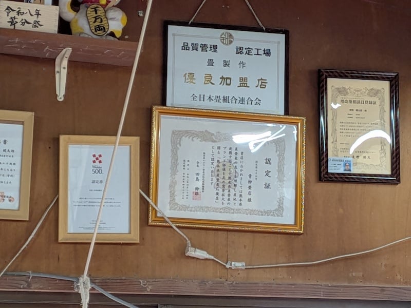 今から10年ほど前、とある会合で昭恵さんと出会った青柳さん。畳について、イグサ農家さんのお話を訴え、短いイグサでこんなものを作っていますと紹介するとその話に感銘を受けられた昭恵さんが、外遊の時などに日本らしいお土産として持っていったのだそうです。そんなこともあって、最近では海外でのお仕事も増えてきて、例えばアメリカのボストンで、子供博物館の畳を現地で張り替え工事とか、香港の大学教授の家の畳の張り替えなどもなさっています。