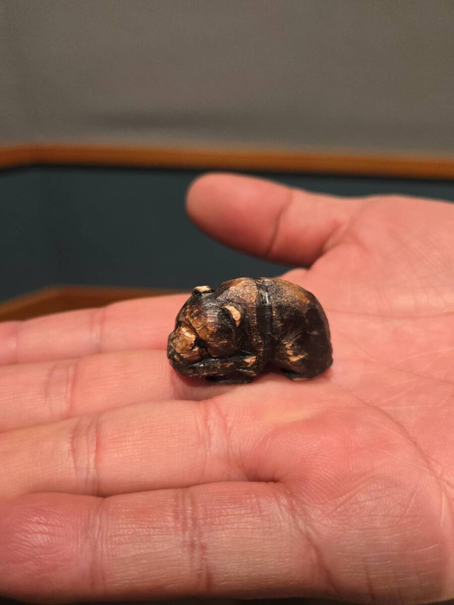 美里さんの手に乗っているのはナカムラ先生が仰っていた、骨董市で見つけた小さい木彫りの熊!