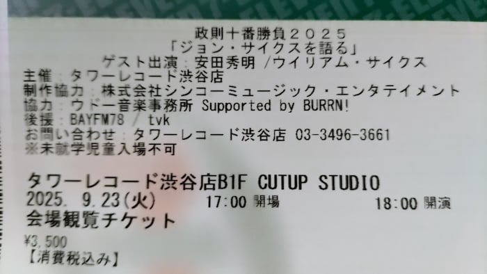 リスナーの天野さんから、『政則十番勝負 2025』千秋楽である、安田秀明さんとウイリアム・"ヘイムス"さんを迎えた「ジョン・サイクスを語る」公演のチケット画像を送っていただきました。「この回のチケッ……