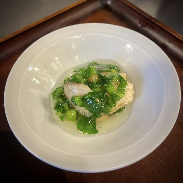 こちらはかいや君おすすめの一皿「ヒラスズキ揚げ物、菜の花あんかけ」